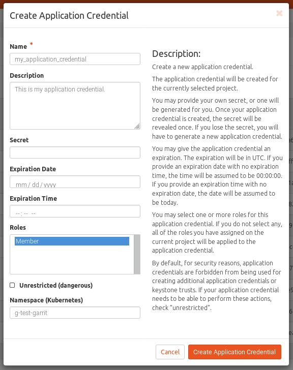 Click the button + Create Application Credential, and fill the form with values of your choice: