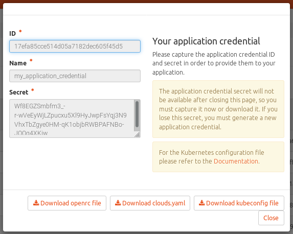 Download the project-openrc.sh file which contains the generated application credential and save it in ~/.openstack/. Execute project-openrc.sh to load the application credentials in your environment.