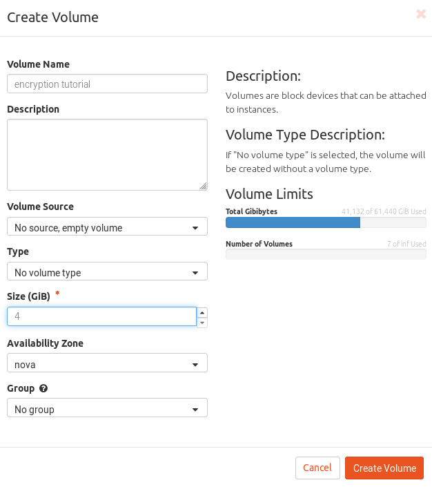 - create a new volume. From dashboard, click on "Volumes" and then on "Create Volume", choose a name and a size and click on "Create Volume".