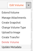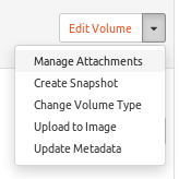 - attach the new volume to the VM. In the volume actions dropdown menu select "Manage Attachments". Select the VM to which the volume will be attached.